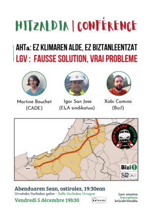 Bizik, abenduaren 5ean, ostiralarekin, Urruñan AHTari buruzko hitzaldia antolatzen du, CADEko eta ELA sindikatuko kideen parte-hartzearekin. Diskurtso ofizialek aitzinatze gisa goresten badute ere, AHTak ez du aterabiderik ekartzen: arazo larria da ingurumenaren, jendartearen eta demokraziaren ikuspegitik. Alta, alternatiba serios bat bada.