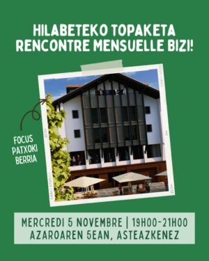 Un résumé du mois écoulé, un temps d’échange sur le Patxoki berri et diverses actualités du moment. La soirée se poursuivra avec un apéro partagé. Ouvert à toutes et tous!