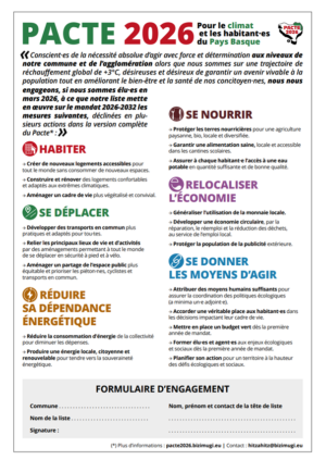 A 3 mois du premier tour des élections municipales, Bizi! publie aujourd’hui la version définitive du Pacte 2026 pour le climat et les habitants du Pays Basque. Les 19 mesures qu’il contient font chacune l’objet d’une fiche détaillée déclinant les actions à mettre en œuvre mais aussi des ressources et exemples. L’association appelle toutes les listes candidates aux élections à signer ce Pacte, s’engageant ainsi à agir avec force et détermination pour garantir un avenir vivable tout en améliorant le bien-être et la santé de tous.