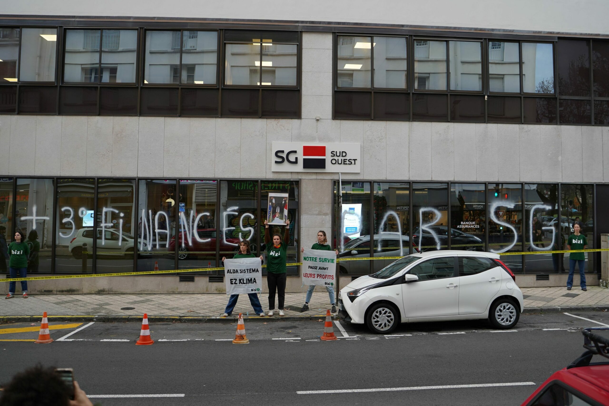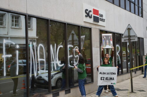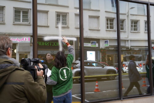 La Société Générale a également été prise pour cible, sa vitrine recouverte d’une inscription “+3°C financés par Société Générale”. Malgré des avancées, la banque investit toujours dans les énergies fossiles. L’ONG Reclaim Finance indique ainsi que la Société Générale a augmenté son financement des projets pétroliers et gaziers de 91% entre 2023 et 2024. Depuis 2015, 1570 nouveaux projets pétroliers et gaziers ont été approuvés ; ils n’auraient pas été possibles sans les financements du secteur bancaire – BNP Paribas, Société Générale et Crédit Agricole en tête – et les garanties d’assureurs comme AXA.