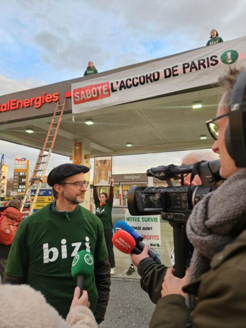 Bizi! a réalisé deux actions coup sur coup chez Total et Société Générale ce vendredi 12 décembre, 10 ans jour pour jour après la signature de l’Accord de Paris. L’association pointe la responsabilité des industries fossiles et la complicité des Etats dont la France dans la poursuite d’une trajectoire de réchauffement climatique de +3°C qui menace les conditions de vie sur Terre. Elle rappelle l’urgence à agir collectivement depuis l’échelle locale pour faire primer l’intérêt général sur les profits d’une minorité.