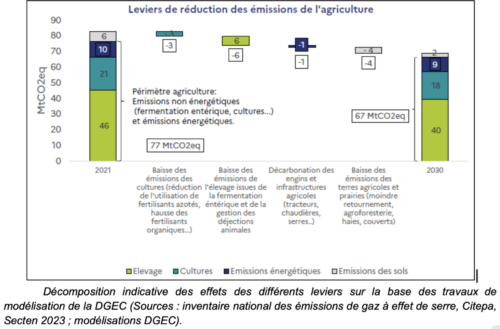 Les émissions du secteur sont en décrue lente depuis le début des années 2000, sous l’effet conjugué de la baisse du cheptel et d’une baisse de la consommation d’engrais minéraux. Les émissions de l’agriculture sont pour la plupart inhérentes au processus même de production.