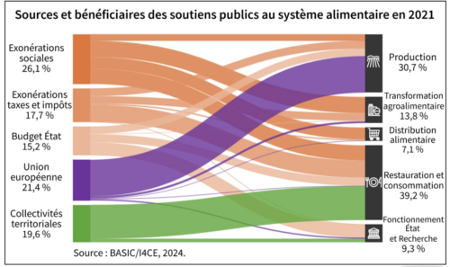 Dans le même temps, 48 milliards d’euros ont été dépensés en soutiens publics aux acteurs du système alimentaire, par le biais de subventions, d’achats directs et d’exonérations fiscales ou sociales. Plus de 80 % de ces soutiens bénéficient à des acteurs pris dans une logique de course aux volumes, qui va de pair avec la standardisation des matières premières agricoles et une pression sur les prix payés aux agriculteurs, favorisant les effets délétères cités plus haut.