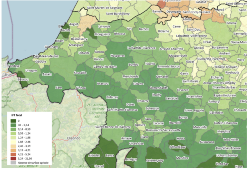 Si le Pays Basque Nord n’est pas le territoire le plus touché par l’usage des pesticides, ceux-ci restent encore bien trop utilisés au regard des enjeux environnementaux et de santé publique. Ainsi, même s’il ne s’agit pas d’une commune avec beaucoup de surface agricole utile, Bayonne est une commune où les cultures semblent plus fréquemment traitées avec des pesticides que la moyenne des autres communes d’Iparralde, en particulier le maïs.