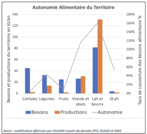 Au regard de la consommation actuelle de la population locale, le Pays Basque Nord est excédentaire en lait, à l’équilibre en viande mais déficitaire en céréales (5 % des besoins de consommation humaine), fruits (10 % de couverture), légumes (40 %) ou œufs (54 %). Les possibilités d’autonomie alimentaire territoriale sont très largement dépendantes de l’évolution du régime alimentaire : consommer mieux et moins de viande permet de doubler la capacité nourricière territoriale ET de diminuer son impact sur le climat. C’est un levier majeur de la sécurité alimentaire de demain.