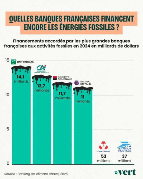 D’après le seizième rapport Banking on climate chaos (en français : Capitaliser sur le chaos climatique), les soixante-cinq premières banques mondiales ont assuré 869 milliards de dollars de financements aux producteurs de charbon, de pétrole et de gaz en 2024, soit 23 % de plus que l’année précédente. Près de la moitié de ces financements – 429 milliards de dollars (368 milliards d’euros) – sont même allés à des entreprises qui continuent de lancer de nouveaux projets d’exploitation des énergies fossiles.