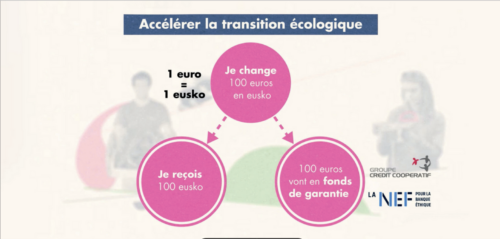 1ʳᵉ monnaie locale d’Europe par la taille de réseau et le volume des transactions (plus de 4,4 millions d’eusko en circulation), l’Eusko développe ainsi les circuits courts de proximité et sa charte exclut les pratiques écologiquement non responsables. De plus, les euros convertis en eusko sont placés dans un fonds de garantie au sein de banques éthiques ou solidaires – le Crédit Coopératif et la Nef – qui financent des projets à forte plus-value sociale ou écologique. Euskal Moneta – association gérante de l’eusko – est en train de développer un projet avec des partenaires bancaires susceptibles de garantir qu’une partie du fonds puisse être mobilisée pour des investissements locaux. Les trois domaines prioritaires d’intervention seraient le logement social, les énergies renouvelables et le foncier agricole.