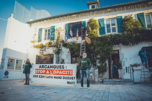 Par une nouvelle action, le 18 novembre à Arcangues, nos militant·es, muni·es d’échelles et de bâches, ont masqué toutes les fenêtres de la façade, empêchant de voir ce qui se passe à l’intérieur de la mairie. Une manière de rendre visible ce que Bizi! reproche à la commune : son opacité. Arcangues est en effet la seule commune de plus de 3500 habitants du Pays Basque à avoir refusé de communiquer des informations relatives à l’environnement.