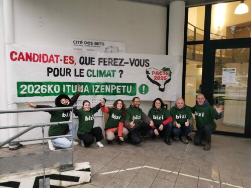 A l’occasion des nouvelles élections municipales, les dimanches 15 et 22 mars prochains, Bizi! a publié le nouveau Pacte pour le climat et les habitant·es du Pays Basque. Les dix-neuf mesures qu’il contient font chacune l’objet d’une fiche détaillée déclinant les actions à mettre en œuvre mais aussi des ressources et exemples. Ces dernières semaines, l’association a appelé toutes les listes candidates aux élections à signer ce Pacte, s’engageant ainsi à agir avec force et détermination pour garantir un avenir vivable tout en améliorant le bien-être et la santé de toutes et tous.
