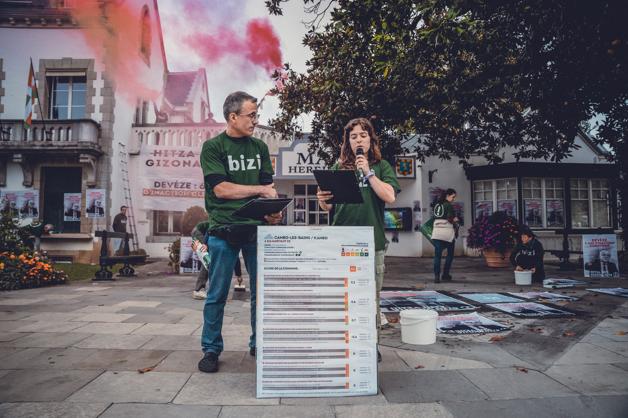Dans sa prise de parole, Bizi! a tenu à rappeler la méthodologie sérieuse et rigoureuse mise en œuvre pour fonder ses appréciations. L’évaluation se base sur les réponses fournies par les communes elles-mêmes, qui ont eu l’opportunité de vérifier l’exactitude de l’évaluation et d’apporter des précisions ou corrections. Pour chaque thème, un binôme de bénévoles a évalué l’ensemble des villes de plus de 5000 habitants, sur la base d’un guide d’évaluation. A la lumière de cette procédure, Cambo-les-Bains est la ville la plus inactive du Pays Basque Nord. Elle obtient le score de 0,2 sur 4.
