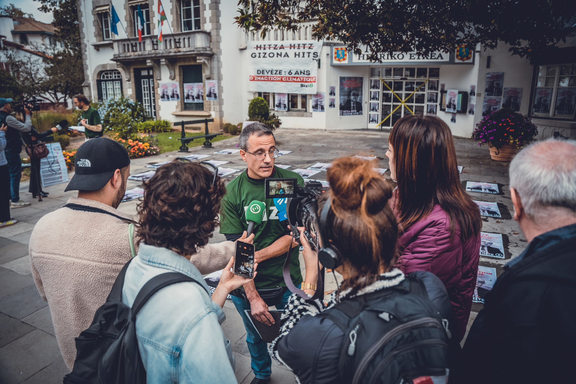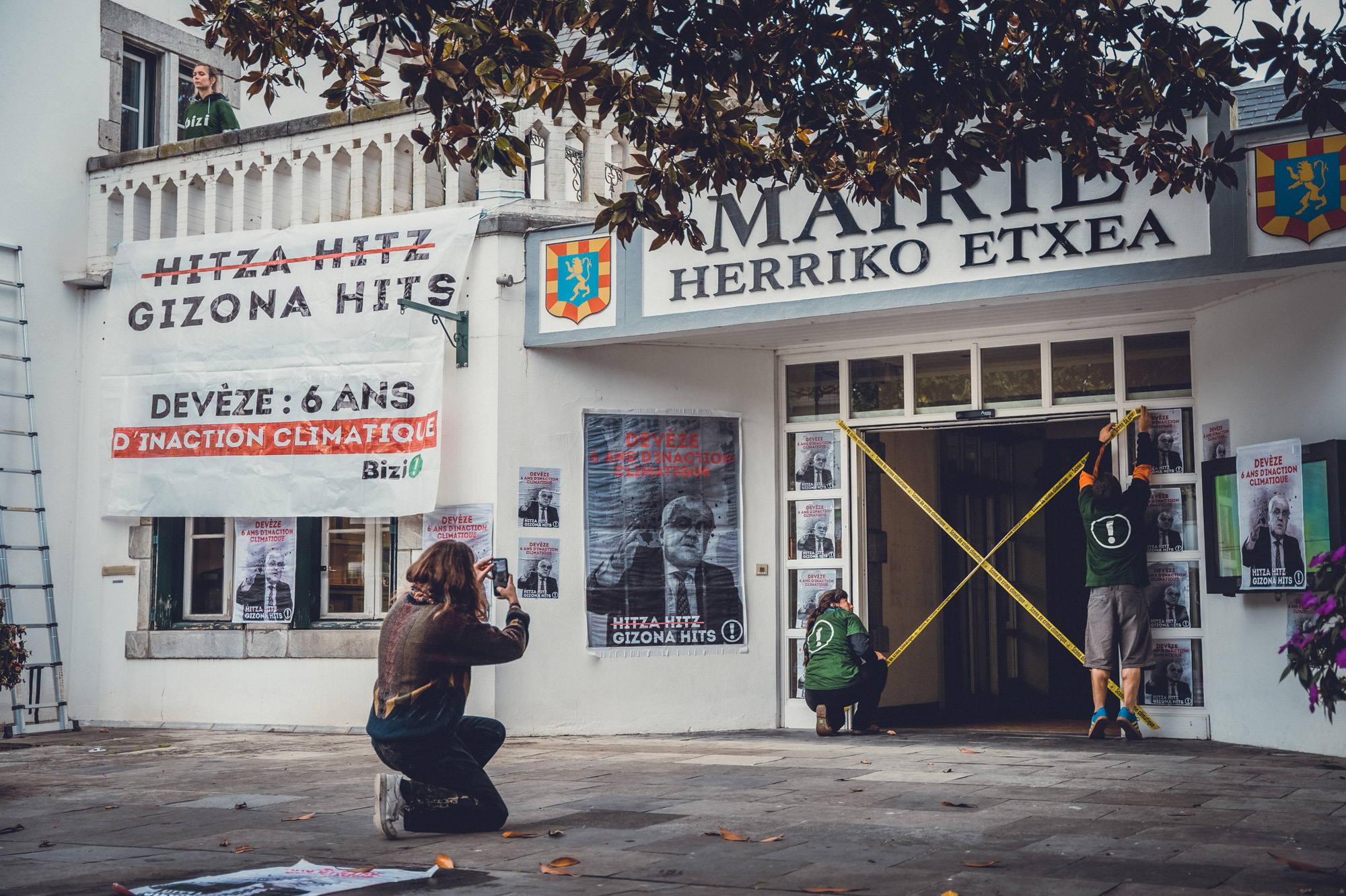 Une vingtaine d’activistes ont fait irruption ce mercredi 15 octobre sur le parvis de la mairie. Après avoir remis au secrétariat une enveloppe adressée aux conseillers municipaux et contenant le bilan du mandat, Bizi! a entrepris de recouvrir la façade de grandes affiches à l’effigie du maire de Cambo-les-Bains, affirmant en lettres rouges “Devèze : 6 ans d’inaction climatique”. Fumigènes, banderole, sirène d’alarme et rubalise délimitant une “scène de crime climatique” ont aussi été utilisés.
