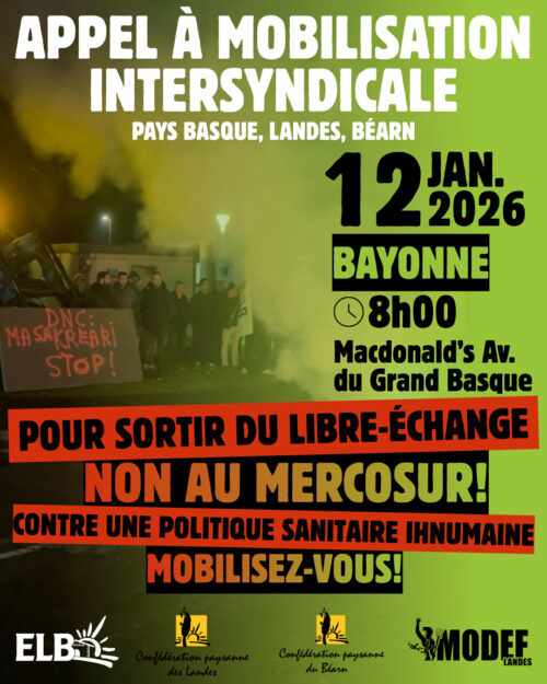Bizi s’associe à l’appel intersyndical suivant : « Face à l’approbation du MERCOSUR par les Etats Européens, ELB, la Conf’ Béarn, le Modef et la Conf’ Landaise appellent à une mobilisation de grande ampleur ce lundi à Bayonne à 8h avenue du Grand Basque devant le Mac Donald’s ! !