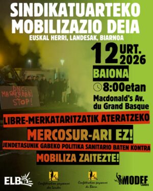 Europar Estatuen MERCOSUR-aren baieztatzearen ondotik, ELB, Conf’ Béarn, Modef eta Landesetako Conf-a mobilizazio handi batentzat deitzen dute astelehen huntan Baionan astelehen huntan Baionan goizeko 8etan Grand Basque-ko etorbidean