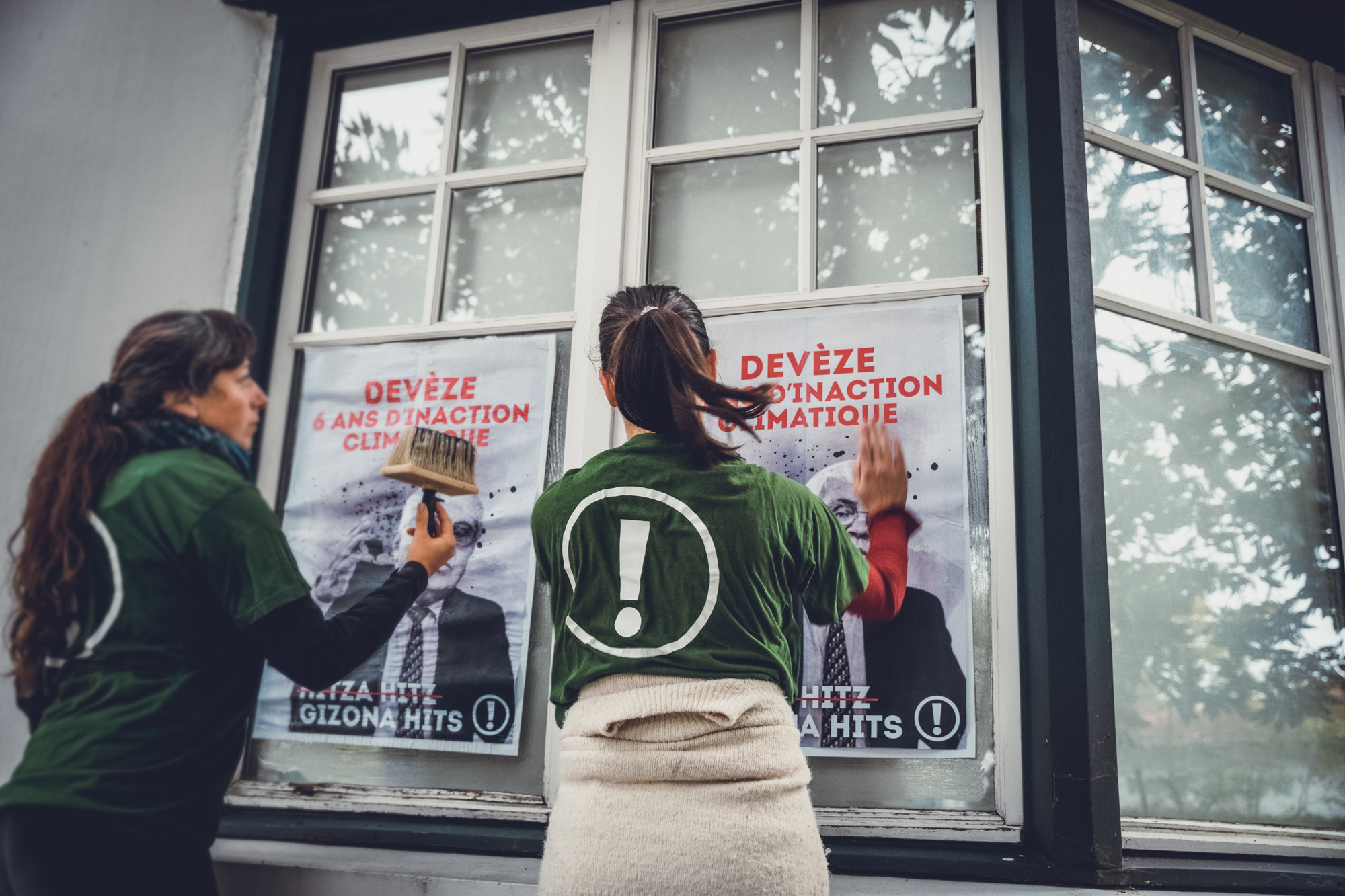 Hogei bat ekintzaile asteazken honetan, urriaren 15ean, Herriko Etxearen atarian agertu dira. Idazkaritzan zinegotziei zuzenduriko gutun-azal bat eman eta gero —bertan kargualdiaren bilana zela eta—, Bizik Kanboko auzapezaren irudia zuten afixa handiekin estali du Herriko Etxearen aitzinaldea, letra gorrietan honakoa irakurtzen zelarik: “Devèze : klimaren arloan 6 urteko geldirik egotea”. Ke-poteak, banderola bat, alarma-sirena eta “klima-krimenaren eszena” mugatzen zuen zinta ere erabili dituzte.