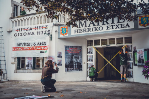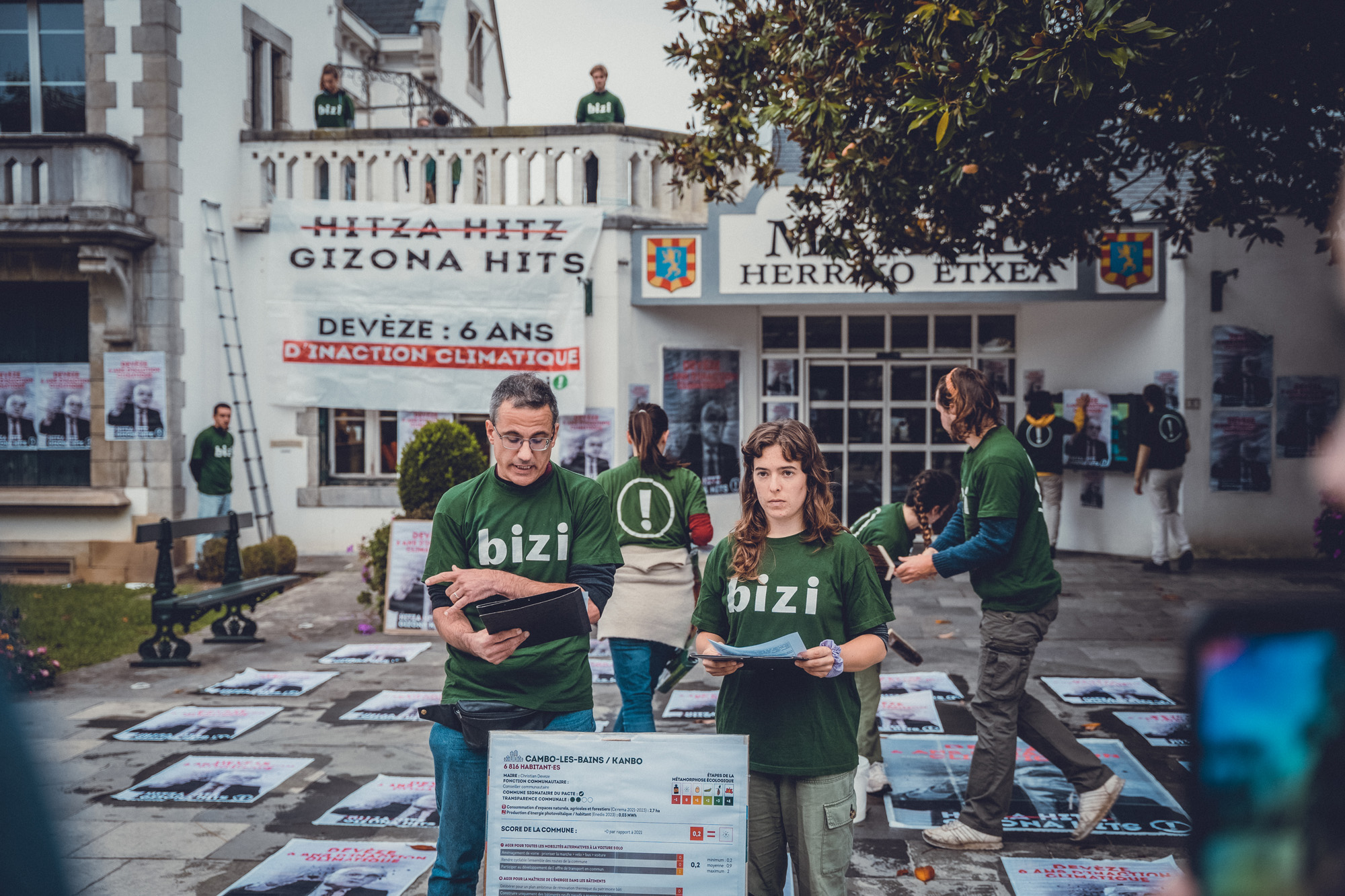 Asteazken honetan, urriaren 15ean, Biziko hogei bat ekintzailek irmoki salatu dute Christian Devèze-en “klimaren arloko 6 urteko geldirik egotea” Kanbon, Herriko Etxearen aitzinaldea afixaz estaliz. Ekintza honekin, Bizik argitara eman du klima-larrialdiaren aitzinean erakutsiriko axolagabekeria, auzapezaren fede txarra eta 2020ko Herriko bozak aitzin, Ipar Euskal Herriko Metamorfosi Ekologikoaren Ituna izenpetuz hartu hitzaren jatea.