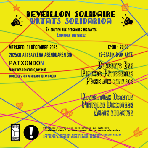 Le 31 décembre 2025, de 12h à 20h, l’association Bizi! organise une après-midi festive en soutien aux personnes migrantes et exilées. Au programme de cette 7e édition: des boissons, des pintxo et des pâtisseries, des concerts et de la musique, une pêche aux canards.